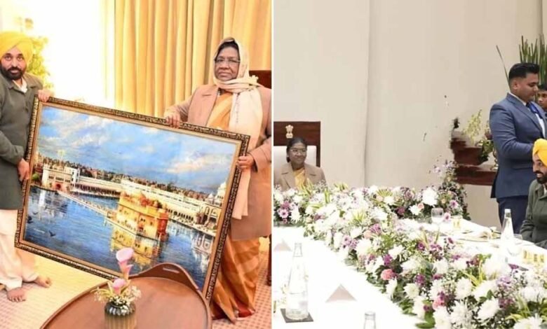 सीएम भगवंत मान ने अमृतसर के होटल ताज स्वर्ण में राष्ट्रपति द्रौपदी मुर्मू से मुलाकात की। इस दौरान उन्होंने राष्ट्रपति को श्री हरिमंदिर साहिब की तस्वीर भेंट कर सम्मानित किया। इस अवसर पर राज्यपाल गुलाब चंद कटारिया भी उपस्थित थे। राष्ट्रपति ने सीएम मान और राज्यपाल के साथ रात्रि भोज किया। बता दें, राष्ट्रपति द्रौपदी मुर्मू गुरु नानक देव यूनिवर्सिटी की 50वीं गोल्डन जुबली कन्वेंशन में शामिल होने अमृतसर पहुंचीं थीं, जिसमें वह मुख्य मेहमान रहीं।