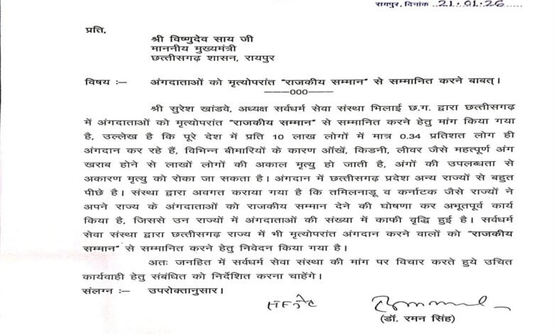 विधानसभा अध्यक्ष ने अपने पत्र में यह भी बताया कि सर्वधर्म सेवा संस्था, (छ.ग.) के अध्यक्ष श्री सुरेश खांडे द्वारा राज्य में मृत्योपरांत अंगदान करने वालों को राजकीय सम्मान दिए जाने की मांग की गई है, जिसे जनहित में अत्यंत महत्वपूर्ण बताया गया है।