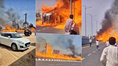 नेशनल हाईवे पर तेल टैंकर पलटा, भीषण आग में 200 मीटर तक उठीं लपटें; एक की जिंदा जलकर मौत