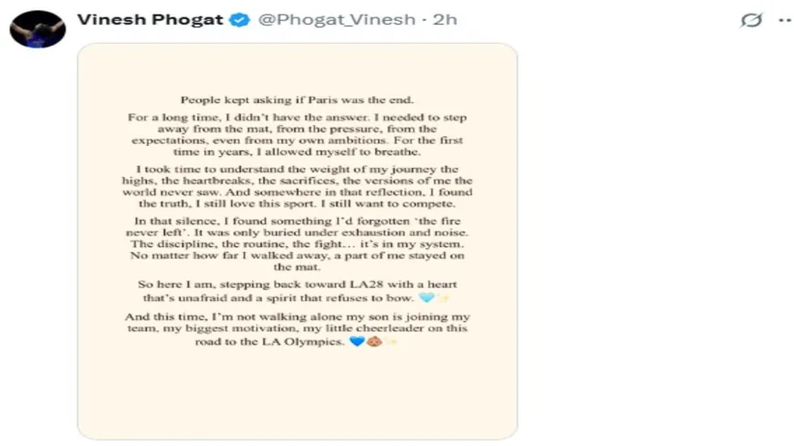 विनेश फोगाट ने लिखा है कि अनुशासन, दिनचर्या, संघर्ष यह सब मेरे अंदर बसा है। चाहे मैं कितनी भी दूर चली जाऊं, मेरा एक हिस्सा मैट पर ही रह गया। कुश्ती को लेकर मेरा जोश कभी खत्म नहीं हुआ। मैं अब यहां निडर दिल और कभी न झुकने वाली भावना के साथ LA28 की ओर वापस कदम बढ़ा रही हूं। इस बार मैं अकेली नहीं चल रही हूं। मेरा बेटा मेरी टीम में शामिल हो रहा है। लॉस एंजिल्स ओलंपिक के इस सफर में मेरा छोटा सा चीयरलीडर।